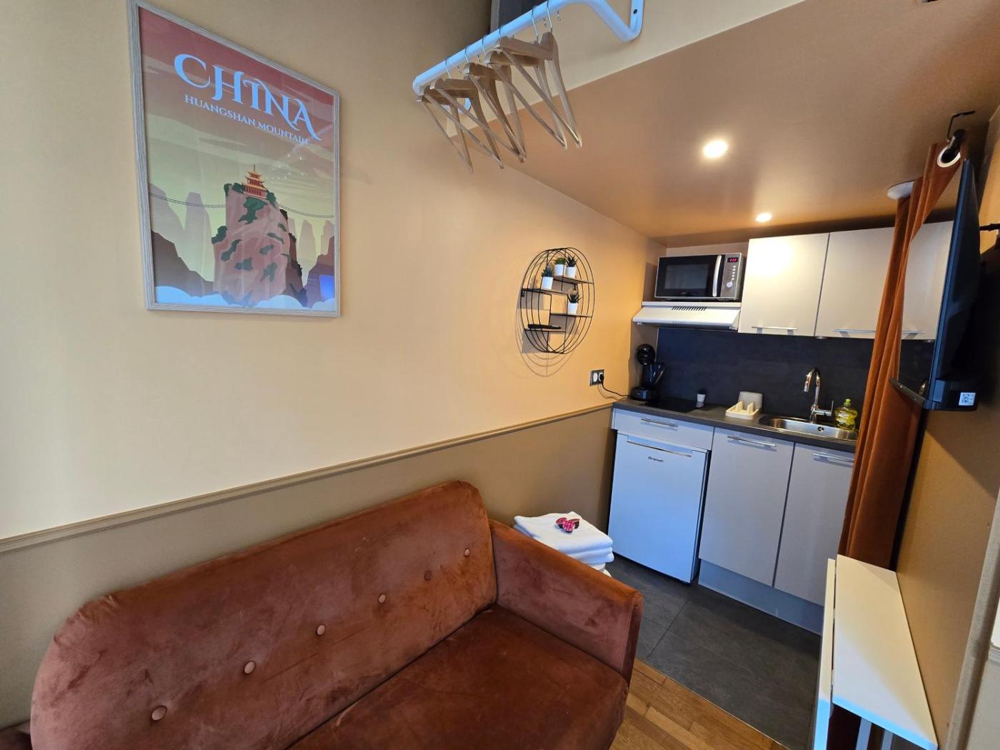 Appartement 1 Chambre. The apartment has 1 bedroom and 1 bathroom with a shower and free toiletries. In the kitchen, guests will find a stovetop, a refrigerator, kitchenware and a microwave. There is a private entrance, soundproof walls and a patio and complimentary chocolate is available for guests. The unit has 1 bed.