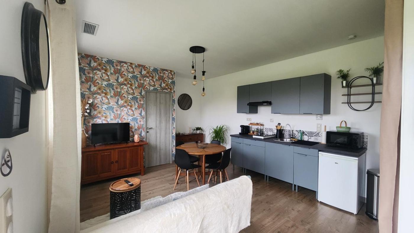 Maison 1 Chambre. This holiday home features a private pool. This air-conditioned holiday home features 1 living room, 1 separate bedroom and 1 bathroom with a shower. Guests will find a stovetop, a refrigerator, kitchenware and a microwave in the fully equipped kitchen. The holiday home also comes with a barbecue. The holiday home features a tea and coffee maker, a dining area, a wardrobe, a flat-screen TV, as well as garden views. The unit has 2 beds.