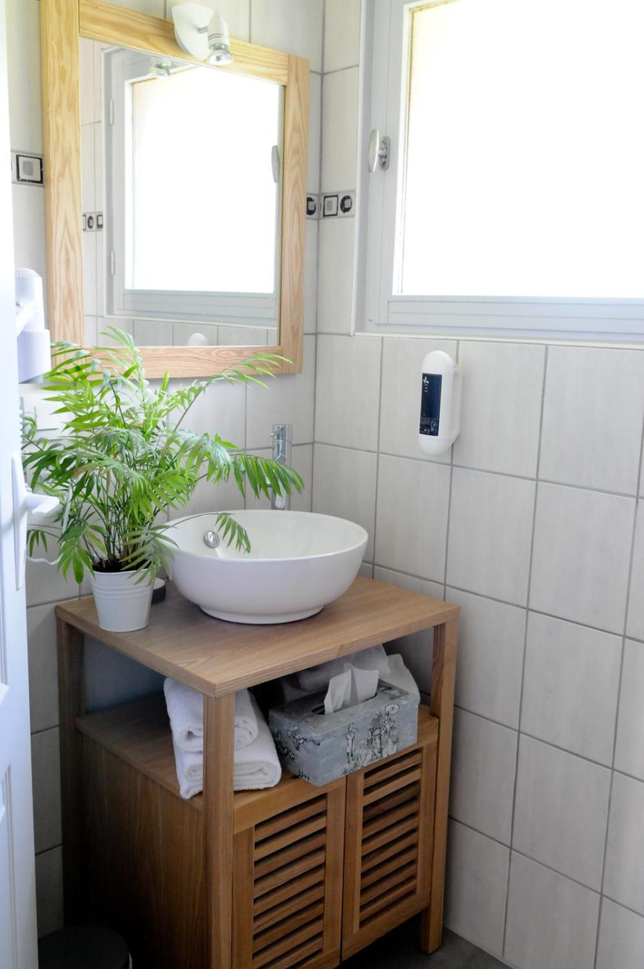 Chambre Double. These en suite rooms are bright and airy with high ceilings and white décor.
